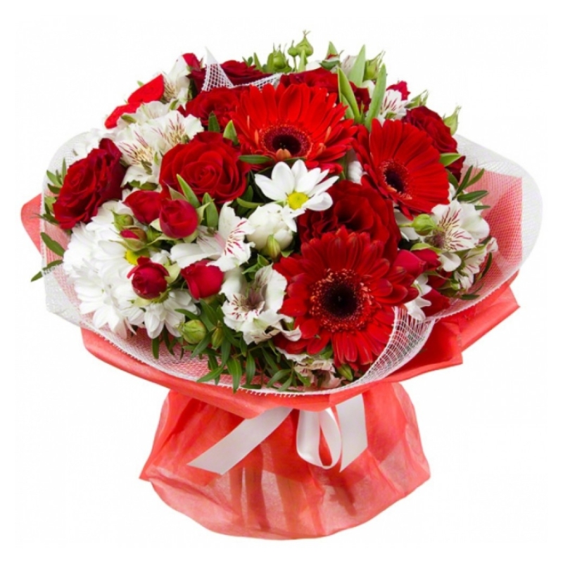 Букет состоит из 3 гербера, 5 роз, 4 альстромерии, 3 кустовые хризантемы, зелень, красивая упаковка, атласная лента.