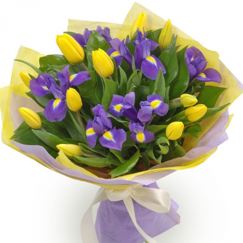 Букет состоит из 11 желтых тюльпанов, 10 ирисов, красивая упаковка, атласная лента.