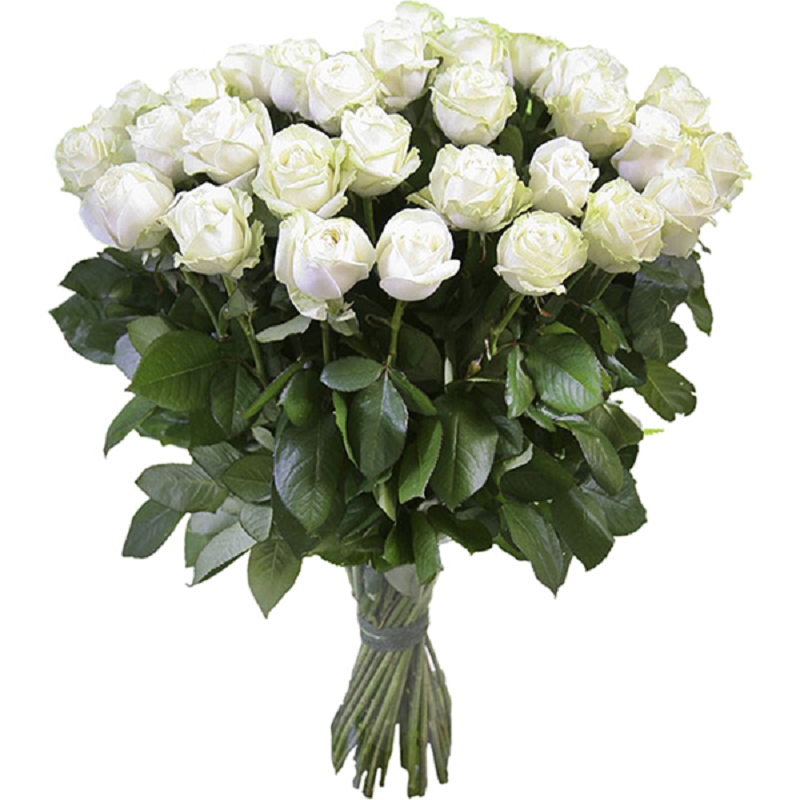 Букет состоит из 31 белая роза, прозрачная упаковка, атласная лента.