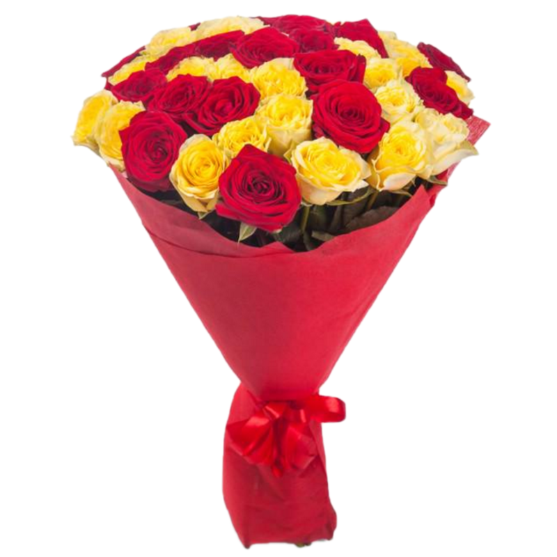 Букет состоит из 23 красные розы, 22 желтые розы, красивая упаковка, атласная лента.